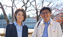 岸野文絵アナウンサーと塩原恒夫アナウンサー 今回は、小高商業高校の3年生の皆さんとプレゼンテーションの授業でした。