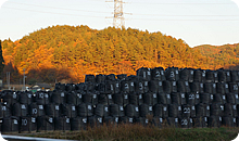 福島駅から一路小高商業高校へ。しばらくすると沿路に「除染作業中」の旗が目に飛び込んできます。そして、たくさん積まれた黒い袋。これらはみな除染によって出た汚染土です。11月上旬、見事な紅葉と山積みされた黒い袋のコントラストに言葉を失いました。