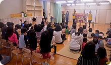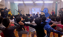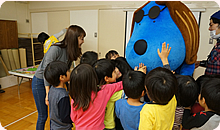 さあ、そんな不安をよそに、時間になって子どもたちが集まってきます。すると、不思議なことに、ひんやりとしていたホールがほんのりあたたかくなってくるではないですか。さすが、『子どもは体温が高いからなあ…』なんてことを思っていると、聞こえてくる「どっこくんは?」「どっこくんどこ!?」という声!すでにどっこくんのことを知ってくれていることに喜びを覚えながら、「どっこくんは来ていないのよ~」となだめて授業を開始します。