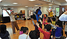 その後サンタ帽姿で登場したラフくんに、子どもたちは大歓声!元気に一緒にダンスを踊り、記念撮影の後は、小さい子たちも怖がることなく沢山タッチ&ハグをしてくれました。