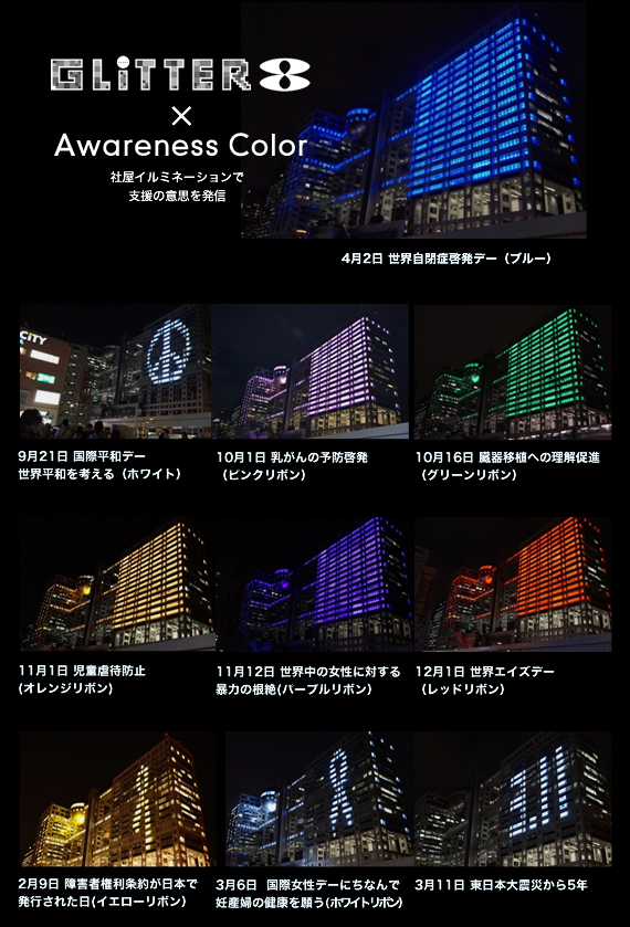 2015年度、社屋イルミネーション「GLITTER8」を活用し、社会課題への支援の意志を色によって発信する企画を通年で行いました。4月2日に世界自閉症デーを皮切りに、10の社会課題について知ってもらうきっかけを提供しました