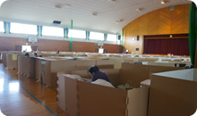 2か所目に伺ったのは400人が寝泊まりする嘉島町の避難所でした。ここではNHKしか映らないテレビが1台だけおいてありました。我々がテレビを設置し、試しに食育出前授業「どっこくん」の体操DVDを流したら、自然発生的にテレビの周りに何人かの方が集まり、体を動かしてくれました。元気な音楽が流れたことで、小さな話し声しか聞こえなかった避難所が少し明るくなったように感じました。その後もテレビの前でじっと画面を見入り、「野球が見られる」とつぶやくお年寄りがいました。