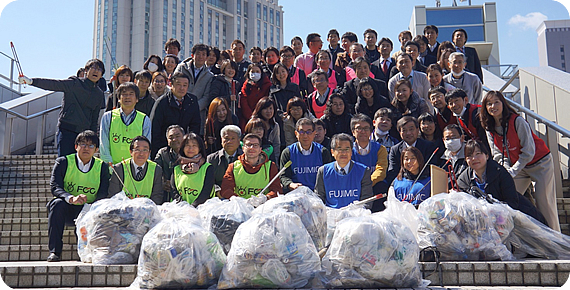 3月10日、春を思わせる陽気の中、第13回フジ・メディア・ホールディングス合同清掃活動が行われました。今回もグループ各社から有志が駆けつけ、17社から76人が参加しました。約45分間の清掃で、70リットルのゴミ袋20個分のゴミを回収しました。