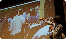 まずは、「テレビカメラマンのお仕事」について、“本物”の現役カメラマンが映像を見せながら説明。そのあとは「ビデオエンジニア」の仕事(=画面の色調整や画像の切り替え)を、大きなスクリーンを使って実演も交えながら披露しました。
