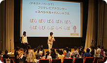 フジテレビに遊びに来てくれた子どもたちやその家族を対象に、1階のマルチシアターで行った特別授業。午前の進行役は、中村仁美アナウンサーと新人の永尾亜子アナウンサー、午後は佐々木恭子アナウンサーと新人の堤礼実アナウンサーです。