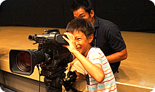 スイッチング体験 スクリーンの映像を実際に子どもたちに切り替えてもらったり、本物の「テレビカメラ」をのぞいて気になる被写体を撮ったり・・・。