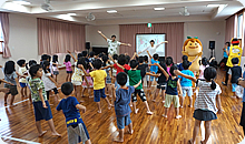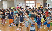 「どっこくん体操」はこちらの園もしっかり予習済み。キレキレに踊る子どもも多くいました。最後に「ピーヒャラダンス」を踊ってみんなとハイタッチ。