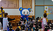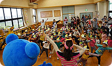 紙芝居のあと、応援に駆けつけてくれたテレビ熊本の人気キャラクター「てれくまくん」が登場すると、大きな歓声とともに子どもたちのボルテージも最高潮、この雰囲気の中、「てれくまくん」と一緒に「どっこくん体操」がスタートしました。