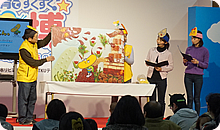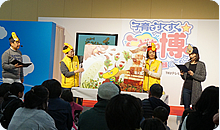 食育出前授業『ハロー!どっこくん。』は土日各2回ずつの公演、全部で4回です。土曜はテレビ熊本・浜田友里子アナウンサー、日曜は荒木恒竹アナウンサーが参加し、鈴木唯アナウンサーと一緒に大型紙芝居を読み、食事と排泄の話をしました。140畳の畳が敷き詰められたイベント会場には、毎回親子100人ほどが集まり、テレビ熊本のアイドル「てれくまくん」と一緒に「どっこくん体操」や「ピーヒャラダンス」も楽しみました。最初は遠慮気味だった子どもたちも、徐々に手を挙げて質問に答えるようになり、ダンスタイムではお父さんやお母さんもノリノリに。