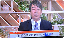 ライトアップについてニュース番組で取り上げ、キャスターもブルーのネクタイを着用。