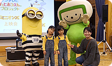 待ち切れないといった表情で映画の上映を待つ子どもたちにサプライズが。なんと映画ミニオンズに登場する『ケビン』が会場でみんなをお出迎えしてくれたのです。握手したり話しかけたり写真を撮ったりと、子どもたちも大興奮のなか上映会がスタートしました。
