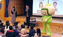 まずはフジテレビ久代萌美アナウンサーとともにミニアナウンス講座を行い、子どもたちと一緒に早口言葉などに挑戦しました。