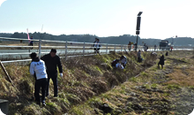 午後には福島県南相馬市の小高地区で地元の高校生38名と一般の参加者など70名で国道6号線沿いに植樹をしました。少し足場の悪い場所での植樹でしたが、テキパキと動いてくれる高校生たちのお蔭であっという間に終了。近くにはこれまでに植樹された苗木が、つぼみがはっきりとわかるほど大きくなっているものもあり、活動が実を結んでいる事を実感しました。