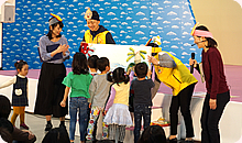 春夏秋冬の食材が沢山出てくる『どっこくん』の大きな紙芝居では、おまじないに出てくる食材を皆さんに探してもらいました。今回は会場に沢山のお友達が集まってくれたので、いつもより大勢のみんなに前に出てきてもらいましたよ。