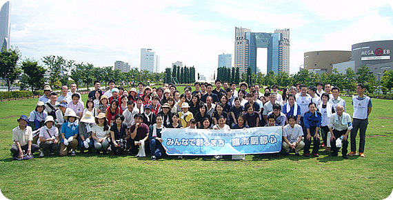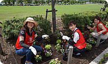 前日の雨が上がり、朝から強い日差しが照りつける中、 まちづくり協議会に所属する企業・団体から100人以上が大集合! フジテレビからも9人が参加し、花の苗を植えました。