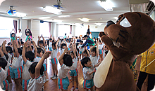 そしてその後は、さんさんテレビのキャラクター「さんのすけ」も来てくれて、子どもたちと楽しく「良いうんち」を作るための体操を学びました。簡単な動きなのに、体操し終わるころには身体がへとへとに・・・。少ない動きで、いかにカラダとお腹の中を動かすかを計算して作られているのだなあと感じました。