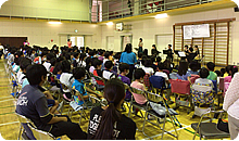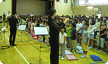 物語が終わると、新美アナと一緒に大きな声で発声練習。そして、最後は「アンサンブル・ミクスト」の演奏に合わせて、全校生で「ビリーブ」を熱唱、体育館に元気いっぱいの歌声が響き渡りました。