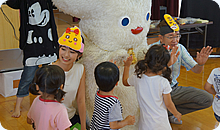 またも元気MAX、1歳~年長まで100人を超える園児に、エビーもおっちゃんも「わんだほ」もたじたじとなるのでした。