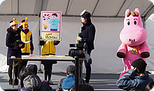 最初は少なかった子どもの数もだんだんと増えてきて、元気よく私たちの質問に答えてくれました。前に出てきてくれたお友達には、『どっこくん』のリフレクターをプレゼント!
