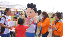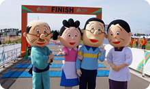 10月13日 心地よい日差しの中、この日は車いすジョギングと親子ペアマラソンが行われました。自分のペースで走る車いすランナー、手をつなぎ笑顔で走る親子などみんなでイベントを楽しんでいました。サザエさん一家はゴールでメダルを授与してランナーたちと触れ合いました。