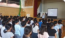 暑い日でしたが、窓を開け放ち、風がとおる体育館に集まった横浜市立東希望が丘小学校4年生の子どもたち(3クラス)は、とても健康的で、元気でした。大きな声で発声練習、そして早口言葉、ニュース原稿読み、どれも思い切り、楽しく体験してくれました。私が子どものころと比べて、みんなとても上手。いろいろなメディアに触れたり、人前で発表する機会がとても多いのではないかと思いました。
