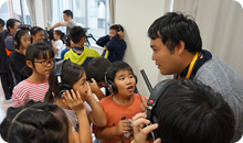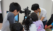 後半は、カメラさん、VE(ビデオエンジニア)さん、音声さんの技術チームの元で、実際のカメラをもったり、モニターに映る映像の色や光をミキサーで変えてみたり、ヘッドフォンをつけてお友達の声をひろってみたり!