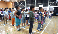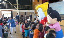 今回は、両校とも全校児童集まって「サザエさん」の上映会を行いました。私たちが準備のため体育館に到着すると、子どもたちも楽しみにしてくれていたのか「サザエさん、来るん?」と広島弁で尋ねてきました。また、先生たちもこの上映会を楽しみにしてくださっていて、「サザエさんは、出てくるんですか?」と。(もちろん登場しますとも!!)