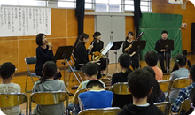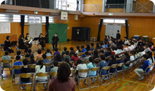 「アンサンブル・ミクスト」の皆さんは、美しく優秀なプロの演奏家集団。でも普段は、とっても気さくで、始まる前から久しぶりにお会いしたメンバーとは近況の話に花が咲きました。そんな温かな雰囲気の中、演奏が行われたのは・・・少々冷えた体育館。(この時期の小学校の体育館ですから、当然です。)