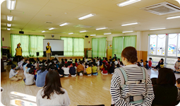 100人近い子どもたちが集まり、授業がスタート!「かっこいいうんちとお友達になろう!」というのがこの授業の大きなテーマ。「毎朝ちゃんとうんちしてる人―??」という質問に元気な返事が返ってきます。