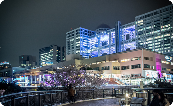 フジテレビの社屋イルミネーションが2020年4月に生まれ変わりました。本社ビルの球体展望室、7階庭園を中心にやさしい光で照らす様子がオーロラに似ているということで、その名もAURORA∞(オーロラ)。カラフルなライトアップで臨海副都心エリアのにぎわいを創出するとともに、2015年4月から始めた社会課題への支援の意思を色で表すアウェアネスカラーライトアップを、2020年度も実施しました。