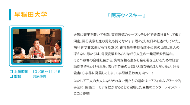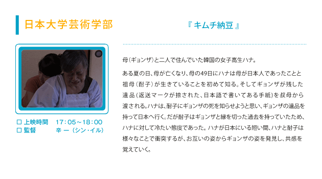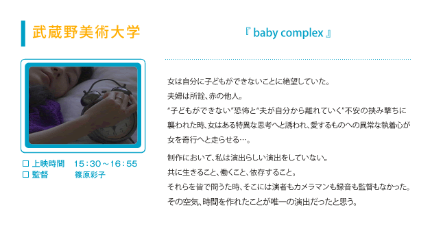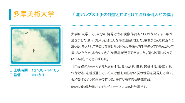 多摩美術大学/東京工芸大学/日本大学/武蔵野美術大学/早稲田大学/日本映画学校(在京6校) |