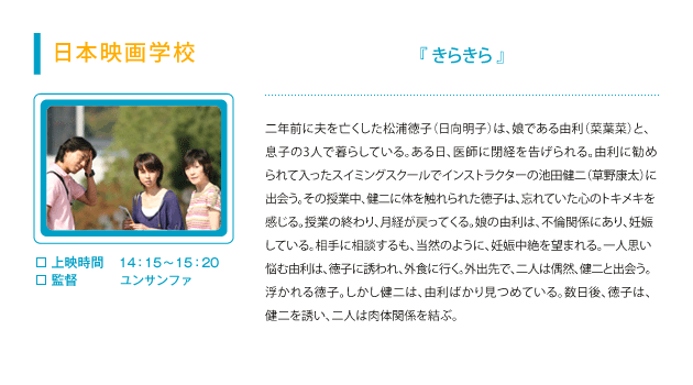 | イベントゲスト | ・映画評論家 佐藤忠男 ・第一線で活躍中の映画関係者 本広克行 「踊る大捜査線THE MOVIE」シリーズ監督/君塚良一 「誰も守ってくれない」脚本・監督 他 ・フジテレビ 映画プロデューサー 他 |