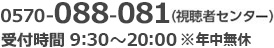 放送する場合もございますので番組名をご確認のうえ、ナビダイヤル:0570-088-081 (視聴者センター / 受付時間 9:30~20:00 ※年中無休)までお問い合わせください。