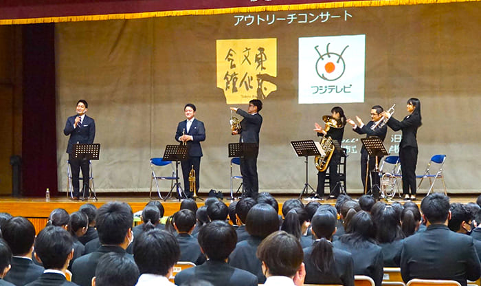 フジテレビと東京文化会館が、年二回のペースで行っている「朗読と音楽の特別授業」。今回は木管楽器ではなく、初めて金管楽器とのコラボ授業です。そして初めて中学校で実施し、演目も初めてとなる「ウエストサイド物語」でした。