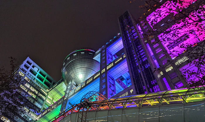 2020年4月に生まれ変わったフジテレビの社屋イルミネーション「AURORA∞(オーロラ)」。カラフルなライトアップで臨海副都心エリアのにぎわいを創出するとともに、2015年4月から始めた社会課題への支援の意思を色で表すアウェアネスカラーライトアップを、2022年度も実施しました。