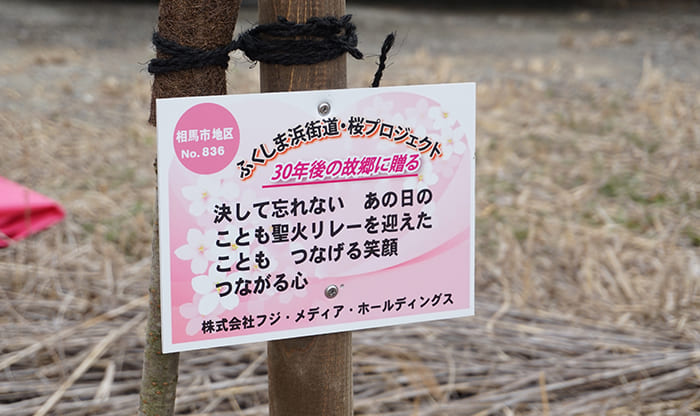 2021年3月28日、フジ・メディア・ホールディングス各社の有志が福島県相馬市で桜の植樹活動を行いました。地震や津波、さらに放射能の影響を受けた福島県で「30年後に子どもたちが世界に誇れる桜並木を作りたい」との思いからスタートした「ふくしま浜街道・桜プロジェクト」。