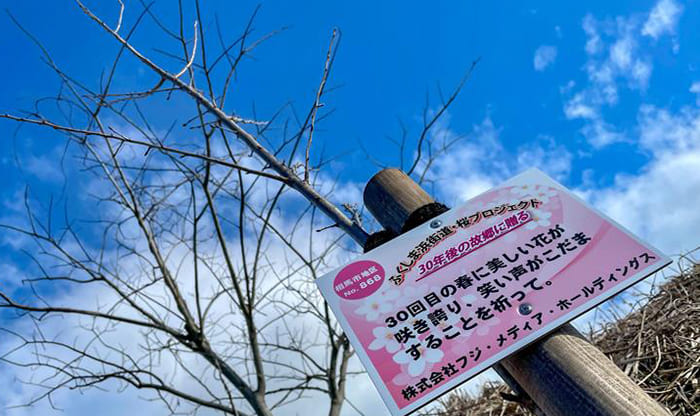 2023年2月4日、フジ・メディア・ホールディングス各社の有志が集い、福島県相馬市で桜の植樹活動を行いました。地震や津波、さらに放射能の影響を受けた福島県で「30年後に子どもたちが誇れる桜並木を作りたい」との思いからスタートした「ふくしま浜街道・桜プロジェクト」。