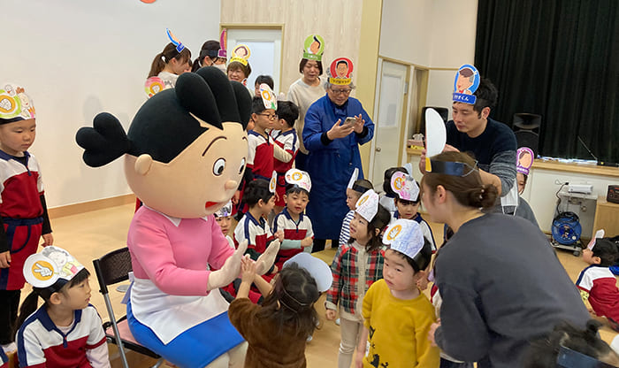 3月13・14日に能登半島地震の被災地、志賀町の志賀小学校と七尾市の11ヶ所の保育施設と矢田郷地区の避難所にサザエさんが訪問しました。志賀小学校では登校してくる児童をサザエさんが玄関前でお出迎え。