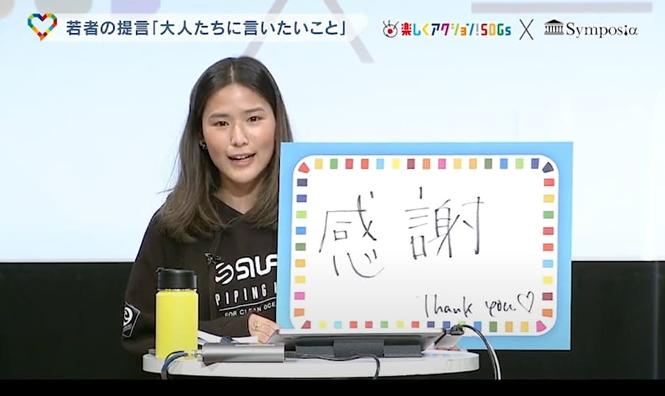 デザインの力で社会に貢献することを目的に動画制作なども行っている「大人に対して文句を言うとかではなく、怒りの先には分断があり、分断の先には戦争がある。何かや誰かを批判するのではなく、一緒に変えていきたい」と。「人は、自分だけではなく家族や周囲の幸せが合わさって初めて幸せと感じる、だから自分や回りのことを考えることが、結果として次世代のことを考えることにつながる」という言葉が印象的でした。