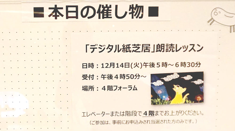 今回の『あなせん』は、いわば特別編リターンズ。「あなせん・デジタル紙芝居」のため、武蔵野プレイスに約1年ぶりにお邪魔しました。『おうち応援プロジェクト・デジタル紙芝居』にある作品の中の3作目「ごん狐」をアレンジし、アナウンサーの代わりに子どもたちに読み手になってもらうものです。音楽や効果音はそのまま。大画面とマイクの前で、アニメの声優さんの録音のように、読み、演じてもらいます。