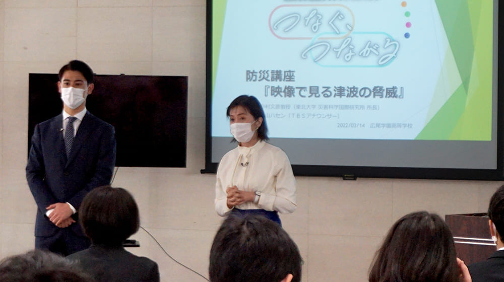 2年目となる今回も番組を放送すると共に次世代に伝えていく取り組みとして、「NHK・TBS・フジテレビ」がともに3月14日に広尾学園中学・高等学校で防災出前授業を行いました。 これは東日本大震災の映像検証を続けてきたフジテレビの番組「わ・す・れ・な・い」で 導き出した「命を守るための行動」の教訓を “未来につながる防災”を目指し、広尾学園の中学生・高校生たちに伝え、一緒に考える防災出前授業です。