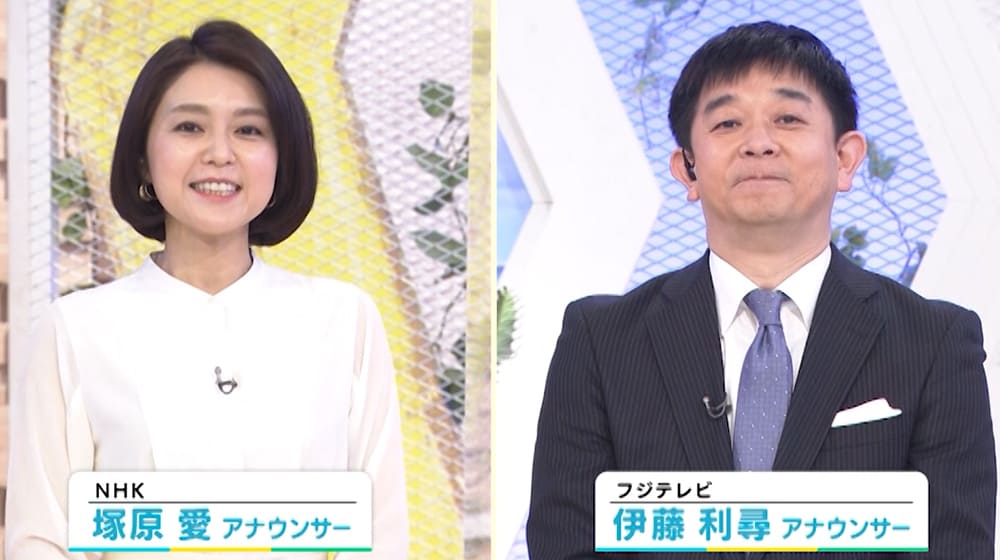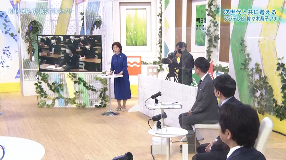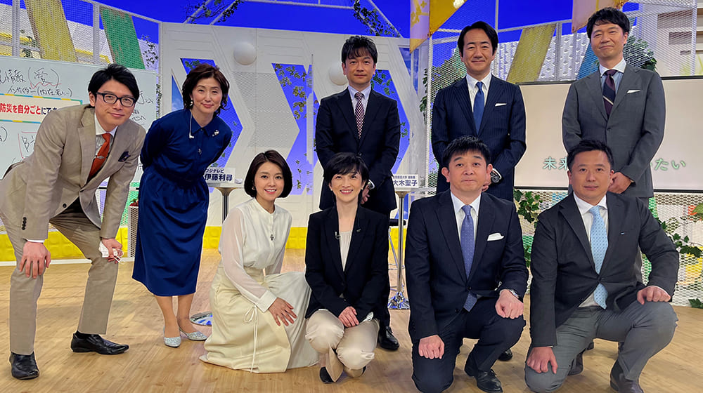 前回のNHKでの番組共演をきっかけに、 NHK在京キー局6局のアナウンサーによる災害報道についての勉強会が継続的に開かれていました。NHKで4月3日に放送した「明日をまもるナビ スペシャル『未来の命を救いたい』」にはその勉強会参加アナウンサーが出演して、どうすれば防災を〝自分ごと〟にできるのかをテーマに議論を展開しました。NHKの塚原愛アナとともにMCを務めるのは前回に引き続き伊藤利尋アナ。