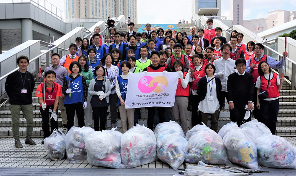 3月10日 優しい春の風を感じながら清掃活動を行いました。今回で29回目となります。フジ・メディアホールディングス傘下の13社、計65人が、お台場エリアをくまなく歩いてきれいにしました。広い集めたゴミは、70リットルのゴミ袋15個分。