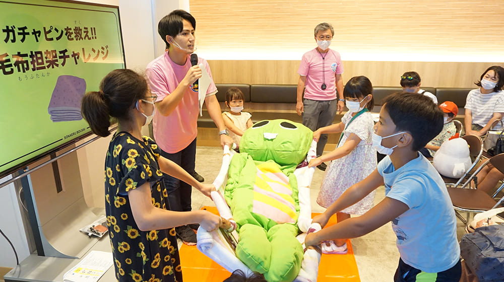 また、成人の体重に近い重さのガチャピン人形を使った毛布担架の体験では、参加した子どもたちの達成感が垣間見える表情が印象に残っています。体を動かしながら防災への取り組みを学んだことで、より記憶に残る時間となったのではないでしょうか。