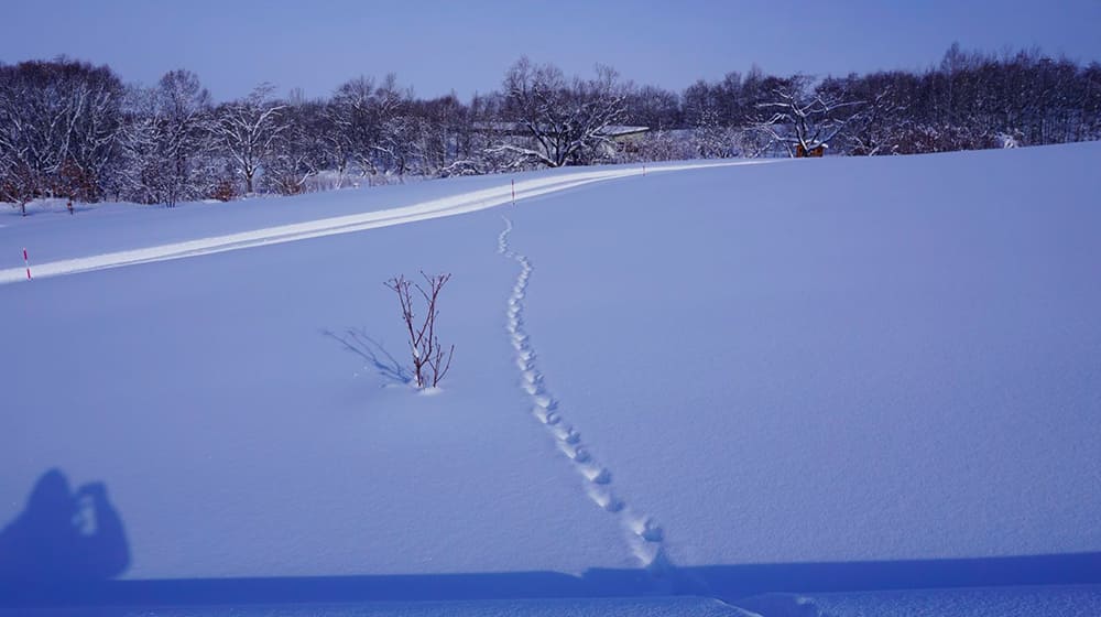 キタキツネが雪の大地をまっすぐ力強く歩いていく様、そしてその足跡を追っていくとホヤホヤのフンとも遭遇!