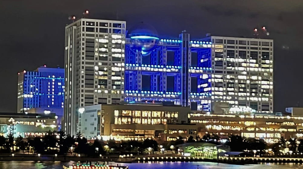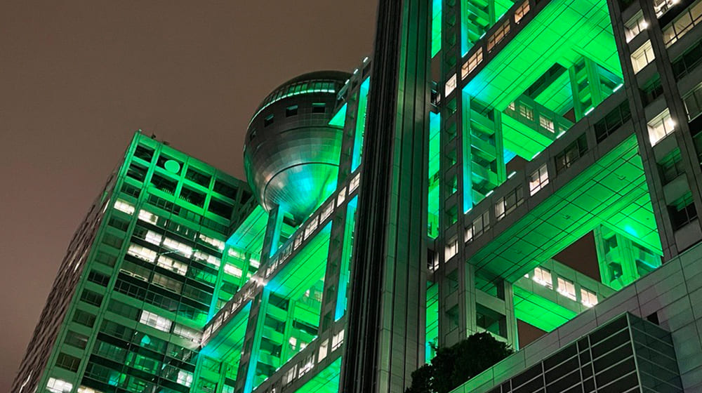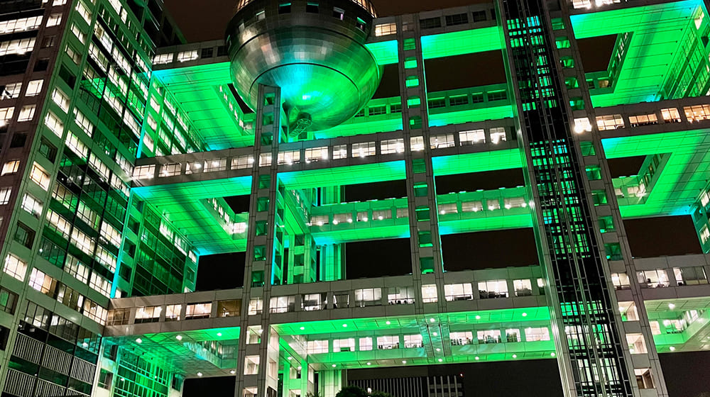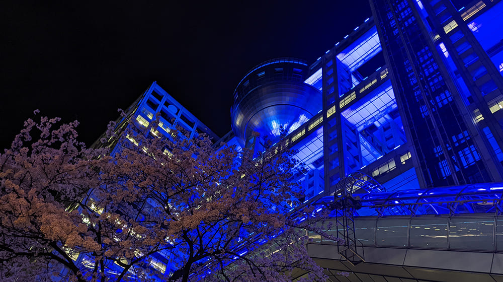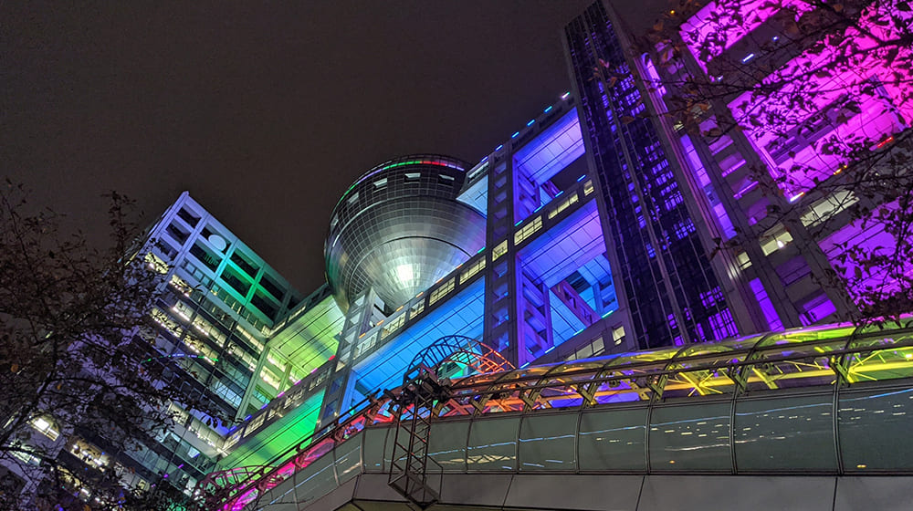 2020年4月に生まれ変わったフジテレビの社屋イルミネーション「AURORA∞(オーロラ)」。カラフルなライトアップで臨海副都心エリアのにぎわいを創出するとともに、2015年4月から始めた社会課題への支援の意思を色で表すアウェアネスカラーライトアップを、2022年度も実施しました。