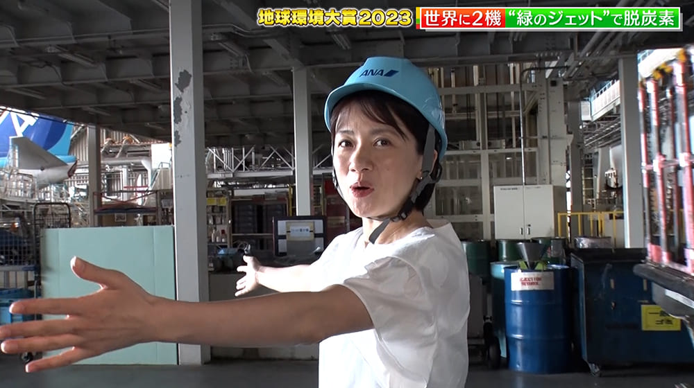 梅津弥英子アナウンサーはヘルメットをかぶりながら、ナイスなリアクションと共に担当者を質問攻め。
