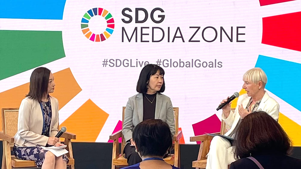 この一連の日本メディアの取り組みが、他に類を見ないということで、9月末の国連ウィークの関連イベント「SDGメディアゾーン」にフジテレビとTBSの担当者が登壇し、「1.5℃の約束」キャンペーンの概要やその効果などについて紹介しました。
