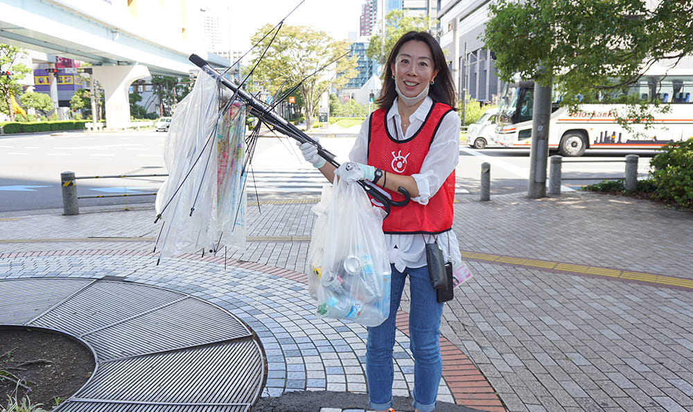 空き缶やペットボトル、壊れた傘、海浜公園の岩場の陰に溜まっている様々なゴミを手際よくわずかな時間で回収しました。