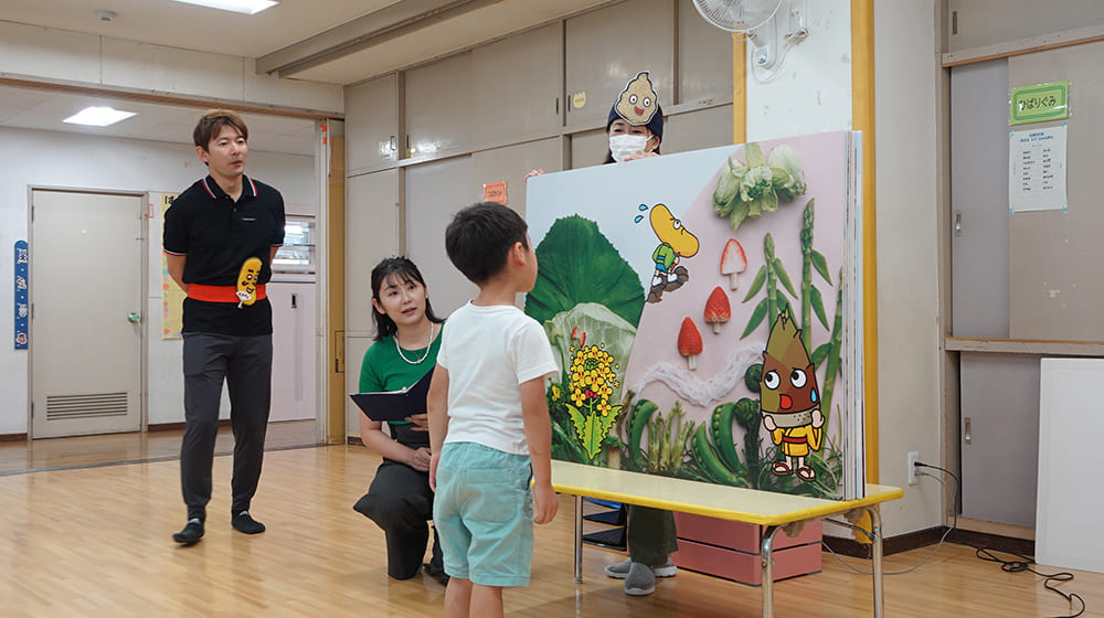 食育の出前授業では、巨大な紙芝居を使い『ハロー!どっこくん。』の冒険を通じて旬の野菜を楽しく覚えます!なんとこの日の給食には、その紙芝居に登場する夏の食材、オクラと糸寒天が入った和え物も登場。知識だけでなく、実際に味わって食や排泄の大切さを学びました。